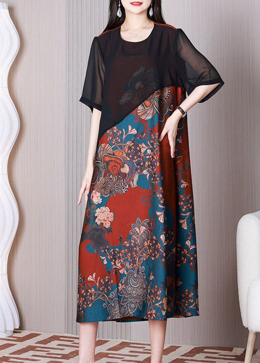 Boho Black O-Neck Patchwork Silk Fake Two Piece Long Dress Summer LY3765