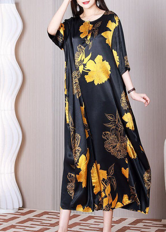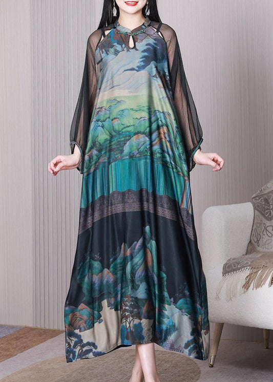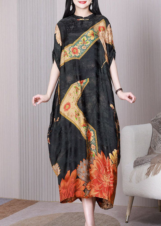 Vintage Black Print Patchwork Chinese Button Silk Long Dress Half Sleeve LY3754