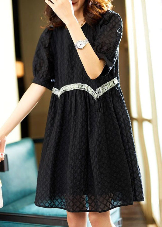 Cute Black O Neck Zircon Patchwork Cotton Dresses Summer LY3860