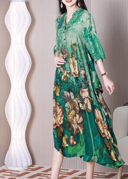 Fashion Green V Neck Oversized Print Silk A Line Dress Half Sleeve LY3770