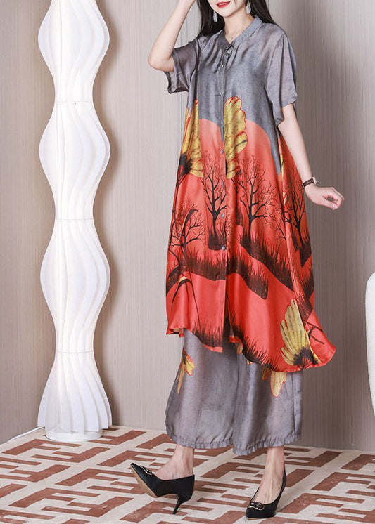 Grey Silk Shirt Dress And Wide Leg Pant Two Piece Set Outfits Oversized Summer LY3768