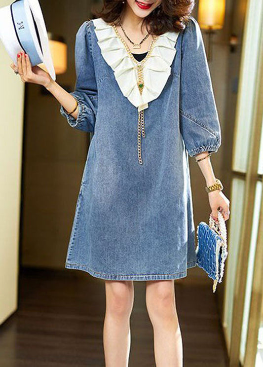 Italian Blue V Neck Ruffled Patchwork Denim Dress Bracelet Sleeve LY3816