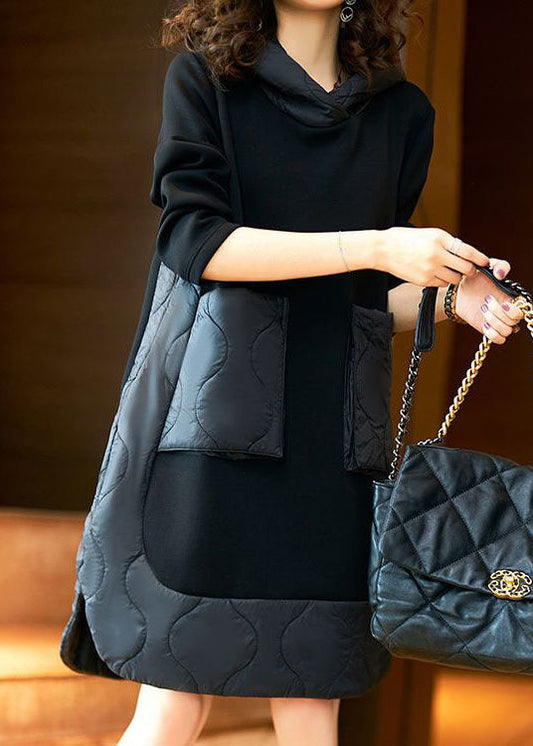 Style Black Hooded Pockets Patchwork Cotton Dresses Spring LY3867