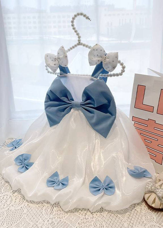 Stylish White Bow Patchwork Tulle Kids Girls Long Dress Sleeveless LY5464