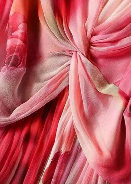 Pink Print Patchwork Silk Dresses O Neck Wrinkled Summer AH479