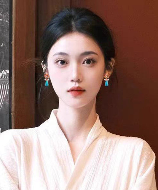 Retro Colorblock Ancient Gold Overgild Inlaid Pearl Enamel Floral Drop Earrings DF1029