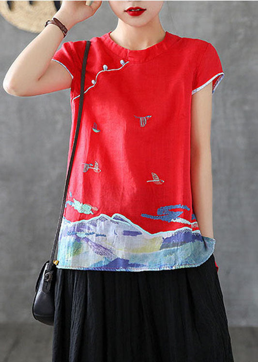 Beautiful Red Embroideried Chinese Button Cotton Tank Short Sleeve TG1008