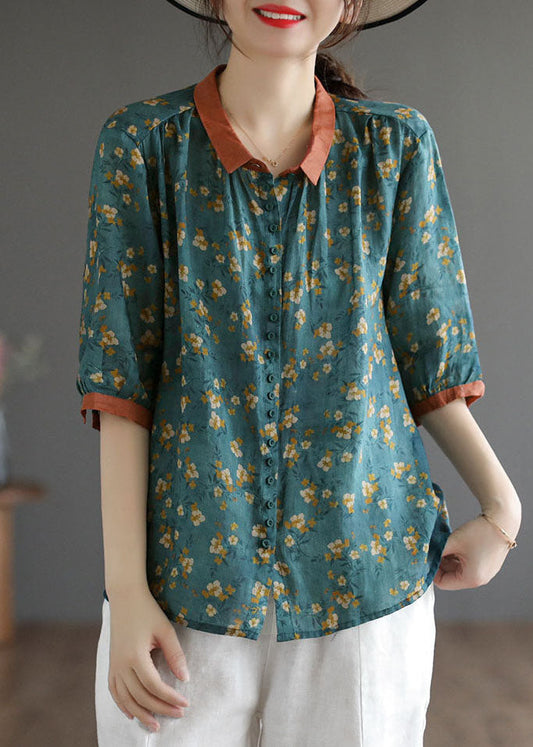 Blackish Green Print Linen Shirts Oversized Button Half Sleeve TG1002