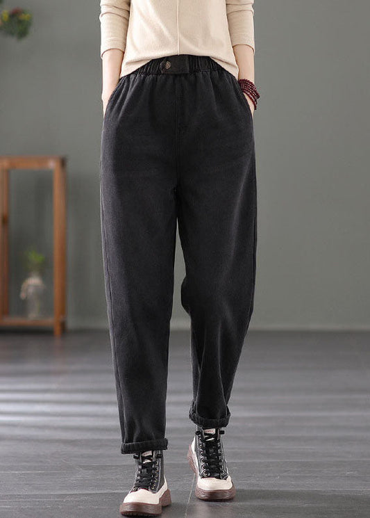 Classy Black Elastic Waist Pockets Warm Fleece Denim Pants Spring TG1021