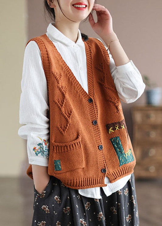 Loose Orange V Neck Patchwork Applique Knit Vest Sleeveless TG1011