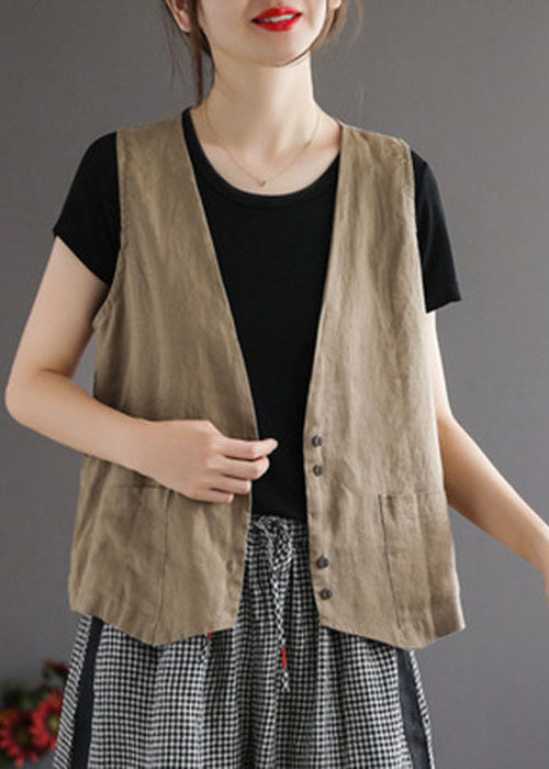 Plus Size Orange V Neck Pockets Linen Vest Tops Sleeveless TG1006