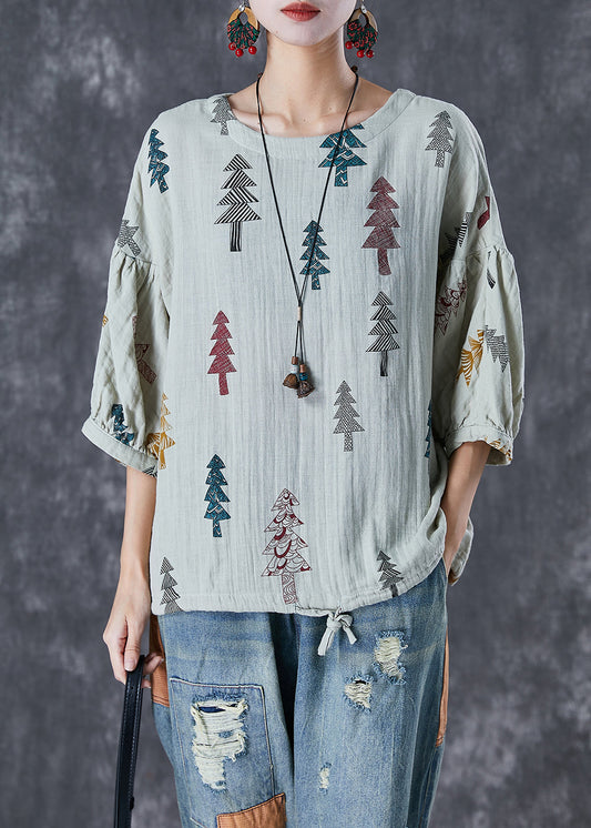 Fashion Grey Print Drawstring Cotton Top Lantern Sleeve TD1025