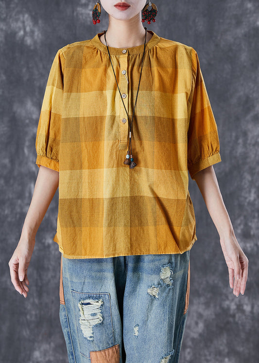Loose Yellow Oversized Plaid Cotton Shirt Tops Half Sleeve TD1023