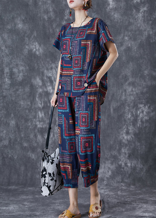 Natural Navy Oversized Print Linen Two Pieces Set Summer TD1011