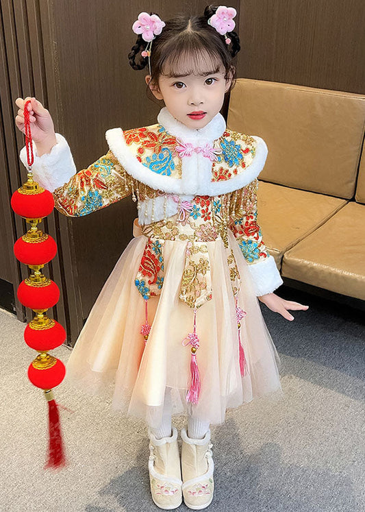 Fashion Champagne Fuzzy Fur Fluffy Warm Button Girls Shawl And Long Dress Two Pieces Set Winter ML0192