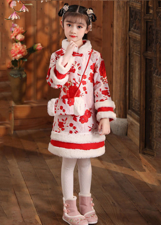 Boutique Pink Stand Collar Print Button Girls Thick Coats And Skirts Two Pieces Set Winter ML0193