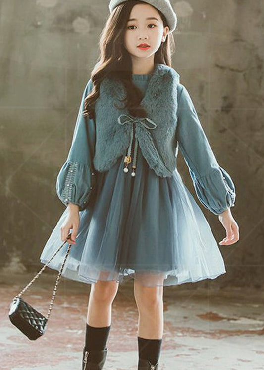 Fine Blue Wrinkled Cartoon Patchwork Tulle Kids Girls Princess Dress Fall ML0218