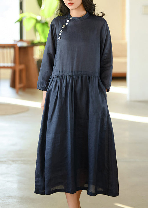 Casual Navy Wrinkled Pockets Patchwork Linen Dresses Fall ML0069