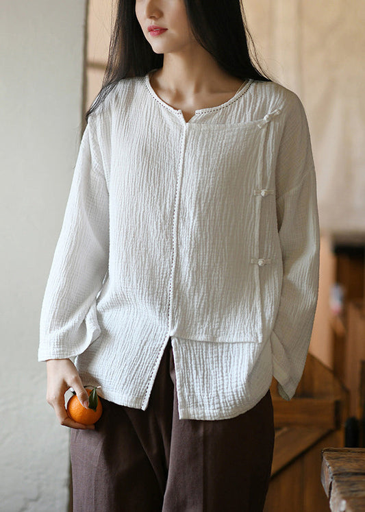 White Button Patchwork Cotton Top O Neck Long Sleeve ML0067