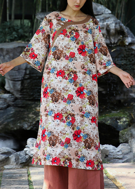 Beautiful Beige Print Side Open Patchwork Cotton Dresses Bracelet Sleeve ML0076