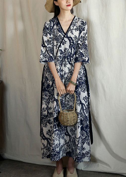New White V Neck Print Patchwork Cotton Long Dresses Bracelet Sleeve ML0071