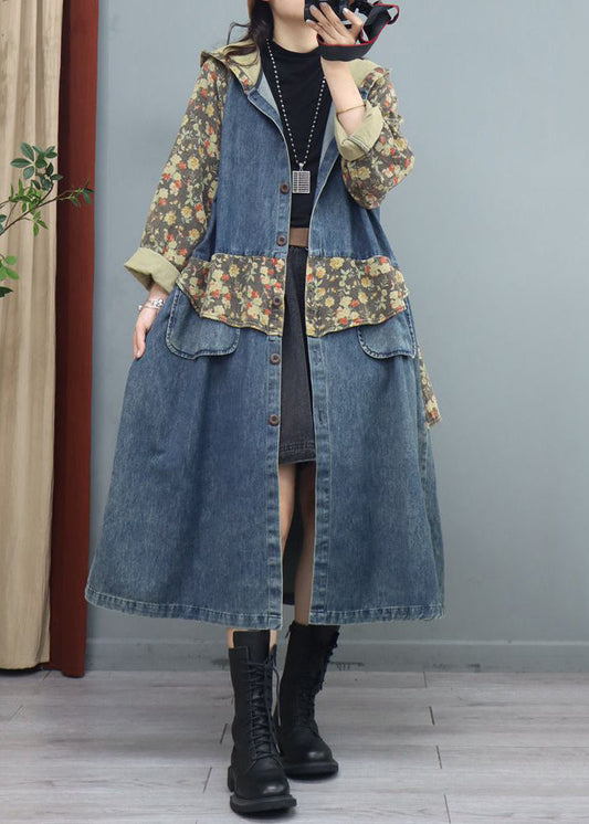 Blue Print Button Patchwork Denim Coat Asymmetrical Long Sleeve ML0096