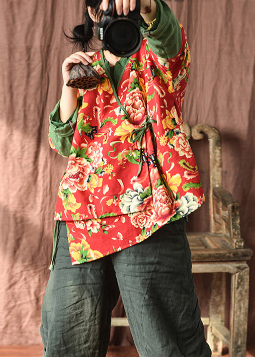 Chic Red V Neck Print Lace Up Patchwork Cotton Coats Fall ML0084