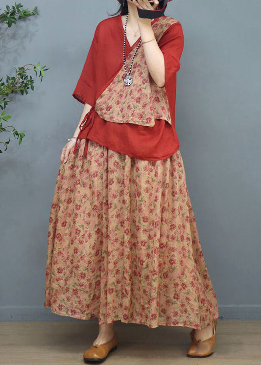 Classy Red Asymmetrical Print Patchwork Cotton Two Pieces Set Summer ML0083