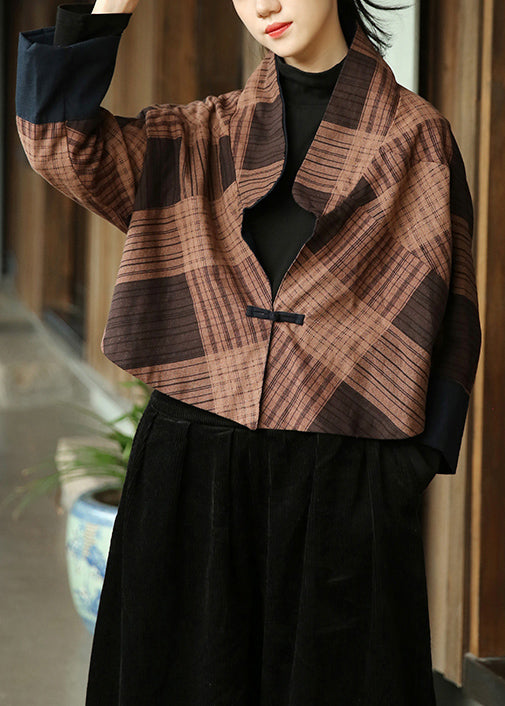 Coffee Button Patchwork Cotton Coat Stand Collar Long Sleeve ML0090