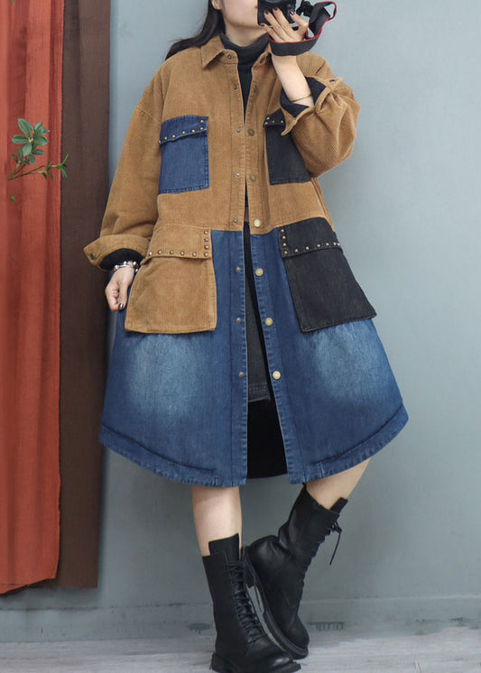Khaki Button Denim Patchwork Long Coats Rivet Long Sleeve ML0082