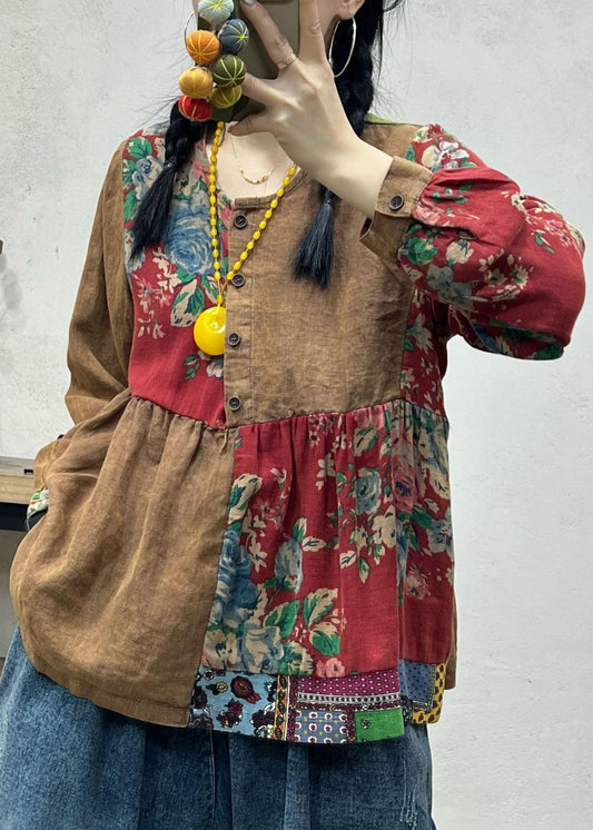 Vintage Black O Neck Print Patchwork Cotton Top Long Sleeve ML0078