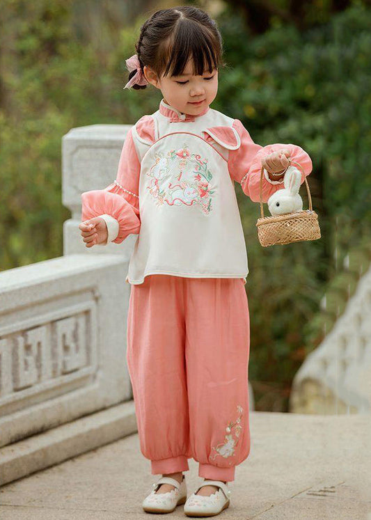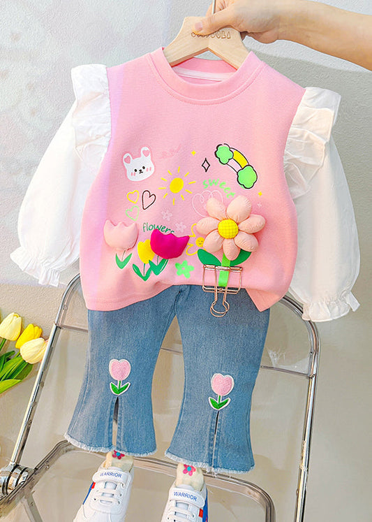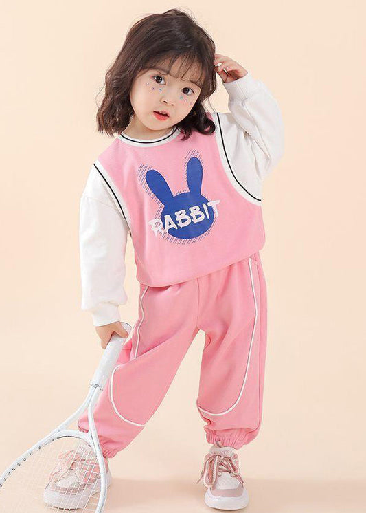 Casual Pink O Neck Print Patchwork Cotton Kids Two Piece Set Fall ML0045