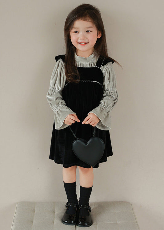 Boutique Black Turtleneck Wrinkled Velour Girls Two Pieces Set Flare Sleeve ML0048