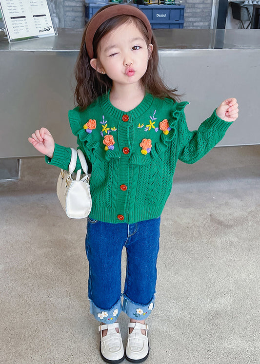 Cute Green Ruffled Knit Coat And Denim Pants Girls Sets 2 Pieces Fall ML0051