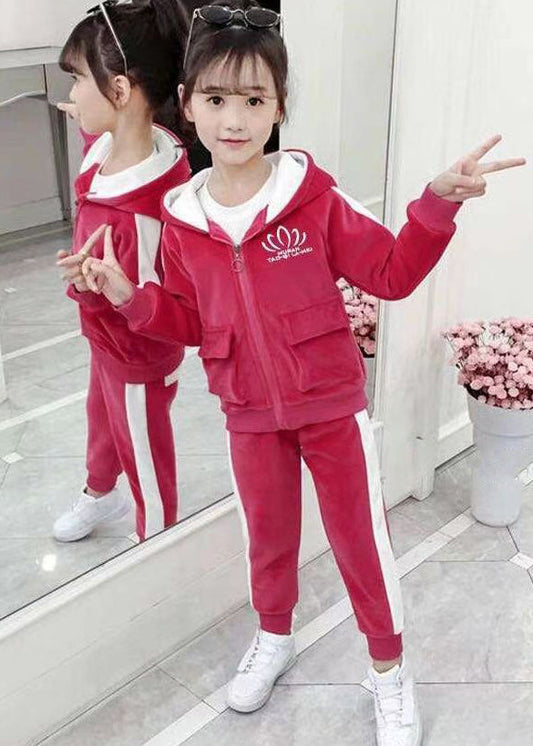 Lovely Pink Hooded Zippered Pockets Warm Fleece Girls Two Pieces Set Winter ML0047