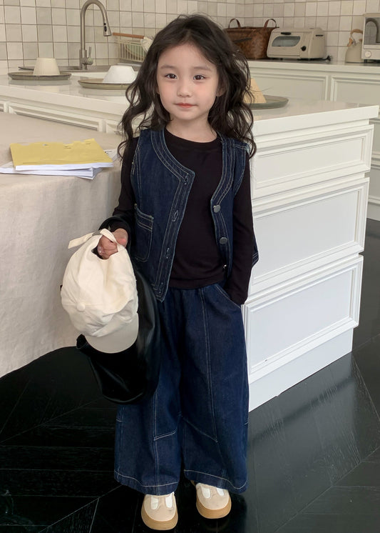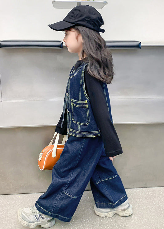 Modern Blue Pockets Patchwork Waistcoat And Pants Girls Two Pieces Set Sleeveless ML0032