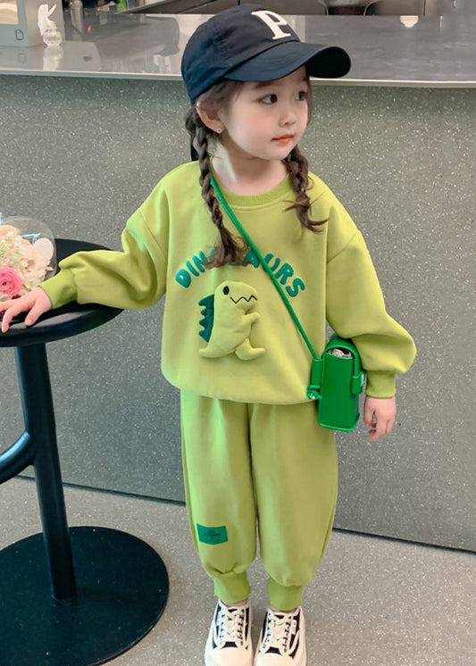 New Green O Neck Print Pockets Cotton Girls Two Pieces Set Long Sleeve ML0042
