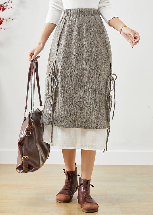 Fashion Grey Elastic Waist Patchwork Lace Up Cotton Fake Two Piece Skirt Fall LY9860