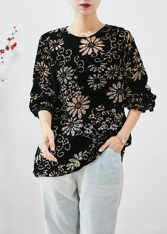 Modern Black Oversized Print Silk Velour Shirt Top Fall LY9872