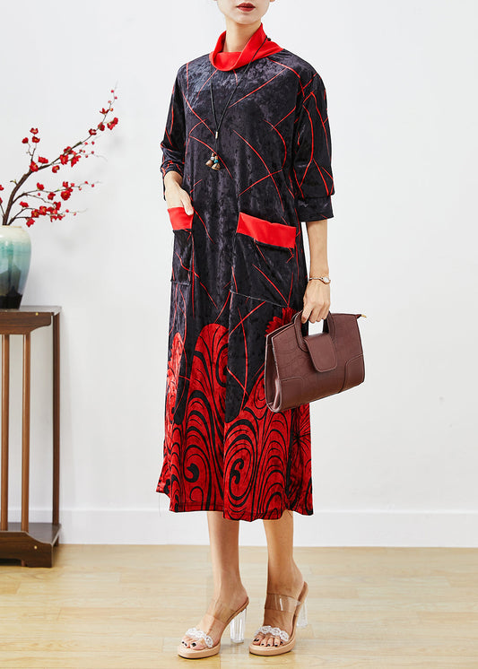 Classy Red Turtle Neck Print Silk Velour Long Dress Half Sleeve LY9873