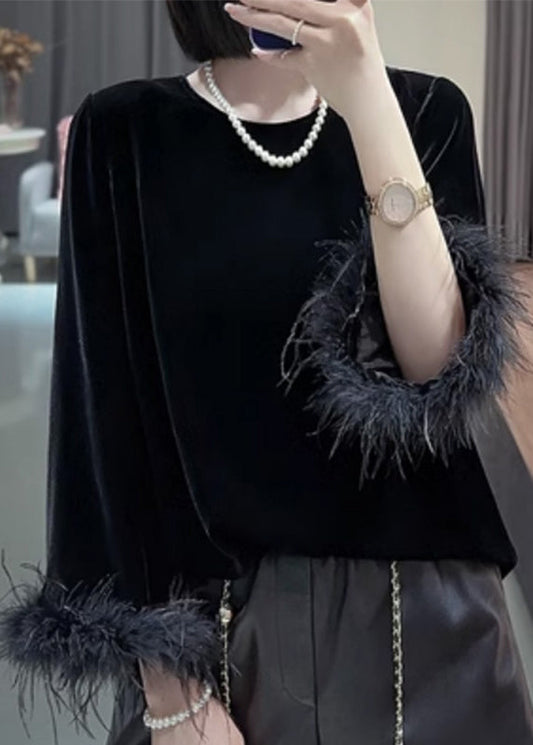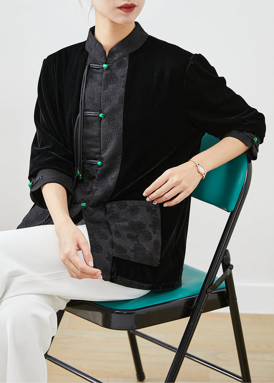 Black Patchwork Silk Velour Shirts Bracelet Chinese Button Sleeve LY9822