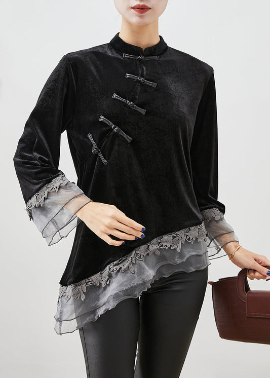 Casual Black Asymmetrical Organza Patchwork Chinese Button Silk Velour Shirt Top Fall LY9818