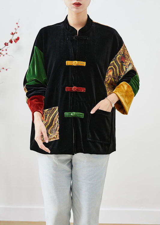 DIY Black Oversized Patchwork Chinese Button Silk Velour Coat Fall LY9829
