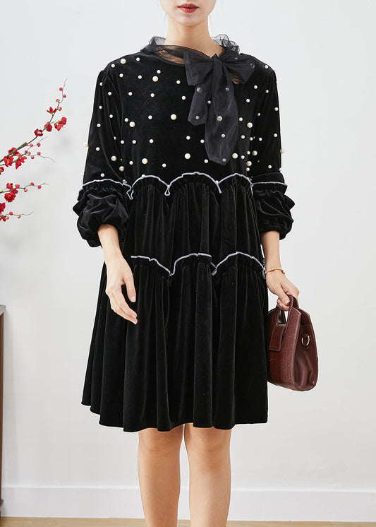 Fashion Black Ruffled Patchwork Nail Bead Silk Velour Maxi Dresses Fall LY9815