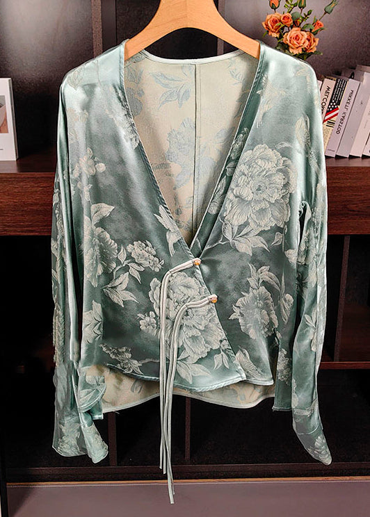 New Green V Neck Print Chinese Button Silk Tops Long Sleeve LY9764