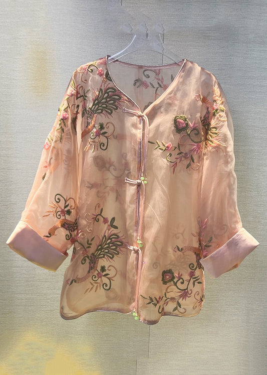 Pink Chinese Button Patchwork Tulle Shirt V Neck Long Sleeve LY9762