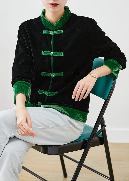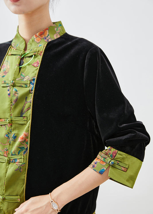 Unique Green Chinese Button Patchwork Silk Velour Jackets Fall LY9825