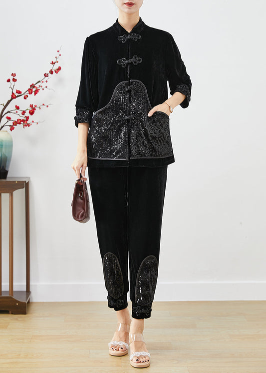Vintage Black Sequins Patchwork Chinese Button Silk Velour Two Pieces Set Fall LY9819