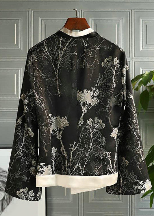 Chinese Style Black V Neck Jacquard Lace Up Silk Tops Fall LY9793