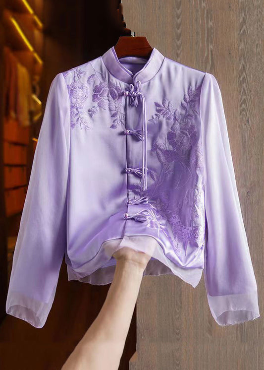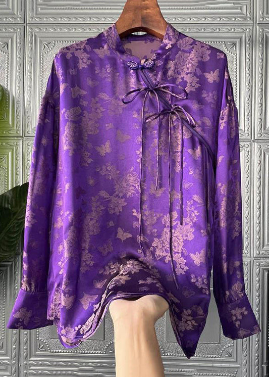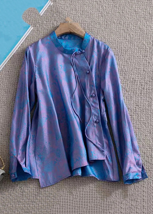 Jacquard Purple Stand Collar Button Silk Shirt Top Fall LY9804